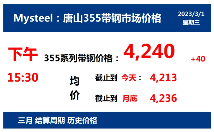 2023年3月1日,下午15:30, 唐山355系列带钢市场价格 4240元/吨,较昨涨40元/吨;本月结算周期,截止到今天均价:4213元/吨,截止到月底:4236元/吨。