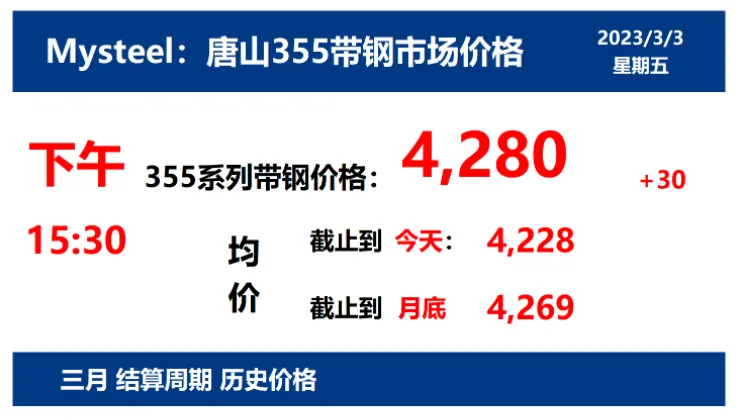 2023年3月3日唐山355带钢市场价格下午15:30,唐山355系列带钢市场价格 4280元/吨,较昨涨30元/吨;本月结算周期,截止到今天均价:4228元/吨,截止到月底:4269元/吨。