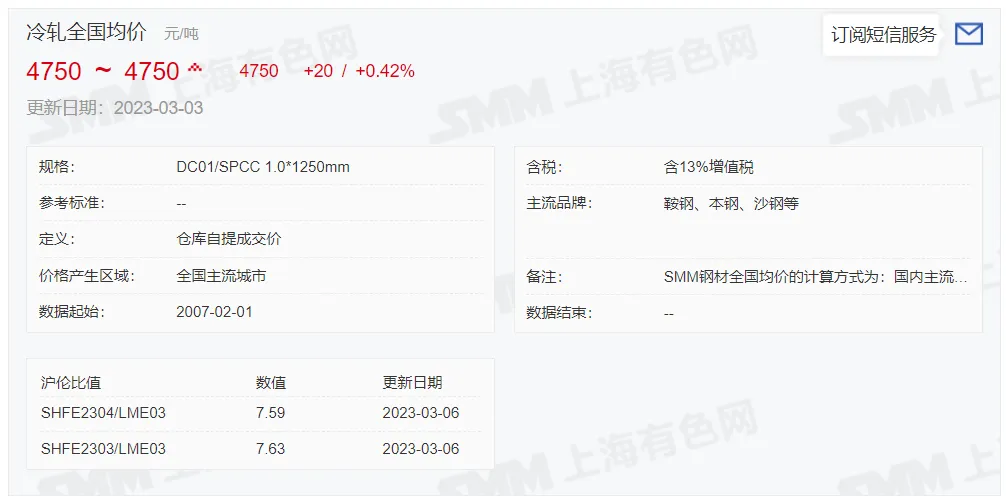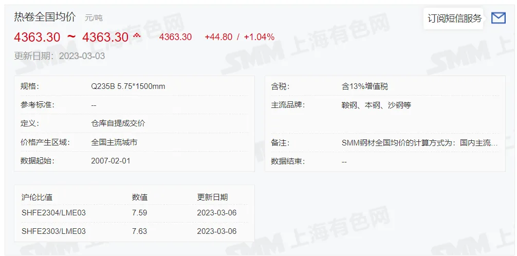 2023年3月6日,上午10:10, 唐山355系列带钢市场价格 4260元/吨,较昨降40元/吨;本月结算周期,截止到今天均价:4248元/吨,截止到月底:4256元/吨。