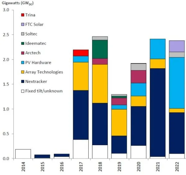 按施工开始年份和跟踪器制造商列出的公用设施光伏容量。Rystad能源