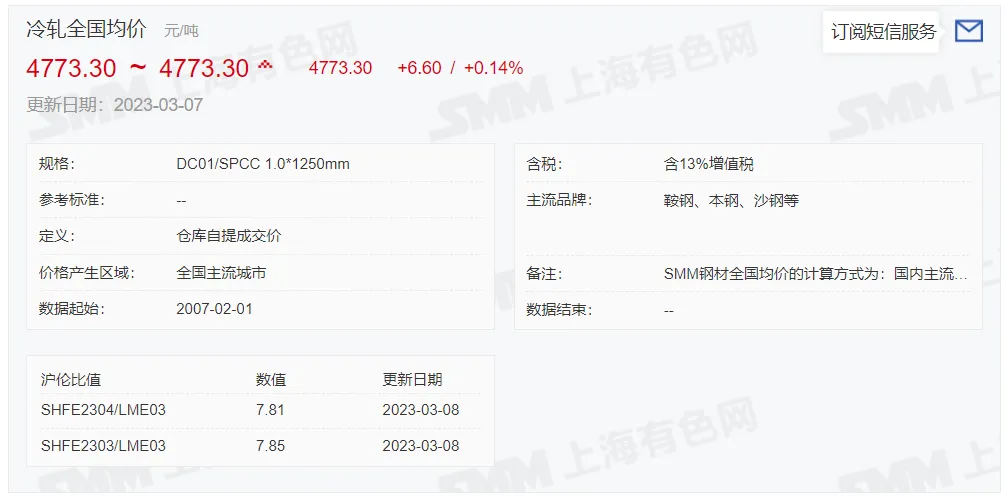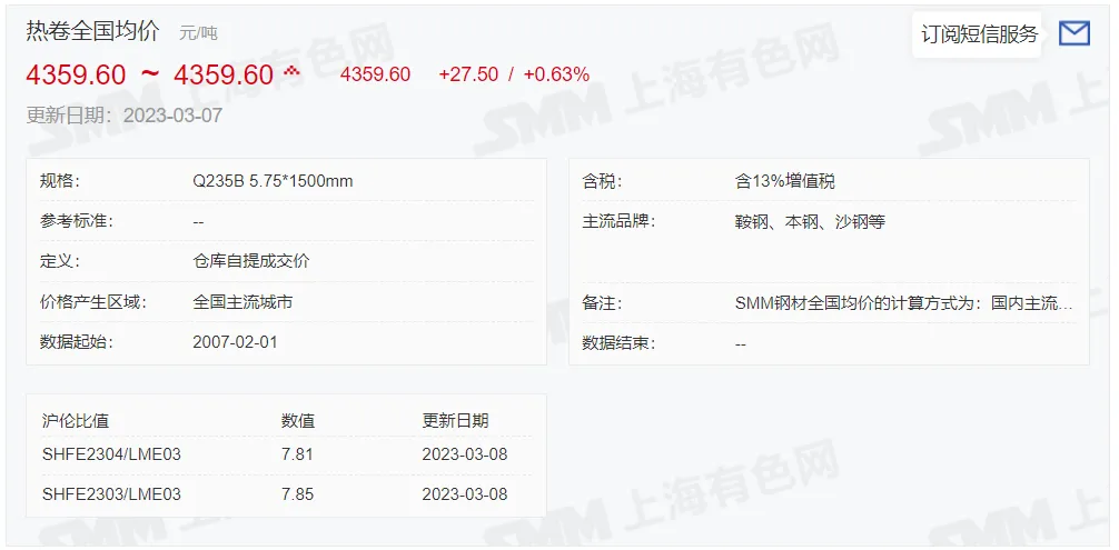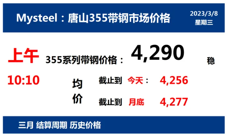 2023年3月8日,上午10:10, 唐山355系列带钢市场价格 4290元/吨,较昨稳;本月结算周期,截止到今天均价:4256元/吨,截止到月底:4277元/吨。