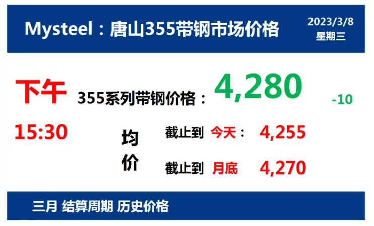 2023年3月8日,下午15:30, 唐山355系列带钢市场价格 4280元/吨,较昨降10元/吨;本月结算周期,截止到今天均价:4255元/吨,截止到月底:4270元/吨。