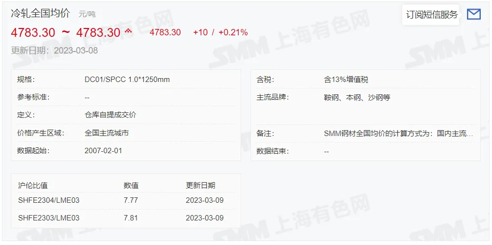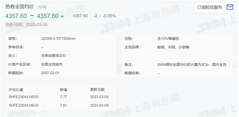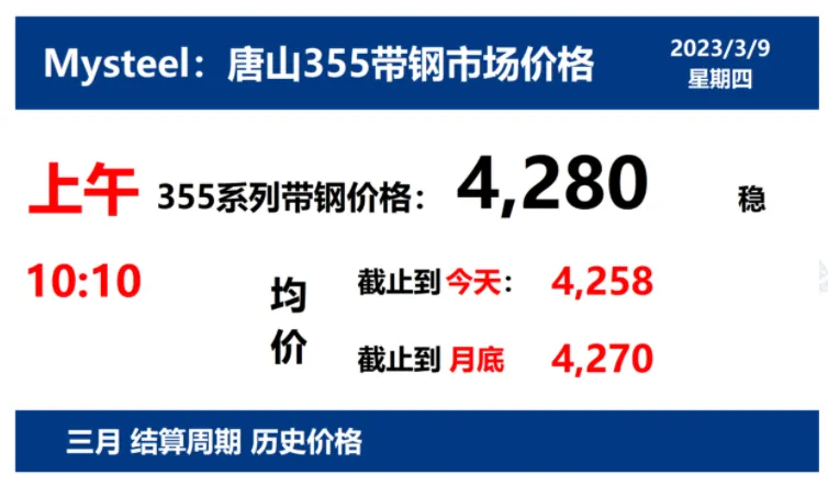 2023年3月9日,上午10:10,唐山355系列带钢市场价格 4280元/吨,较昨稳元/吨;本月结算周期,截止到今天均价:4258元/吨,截止到月底:4270元/吨。