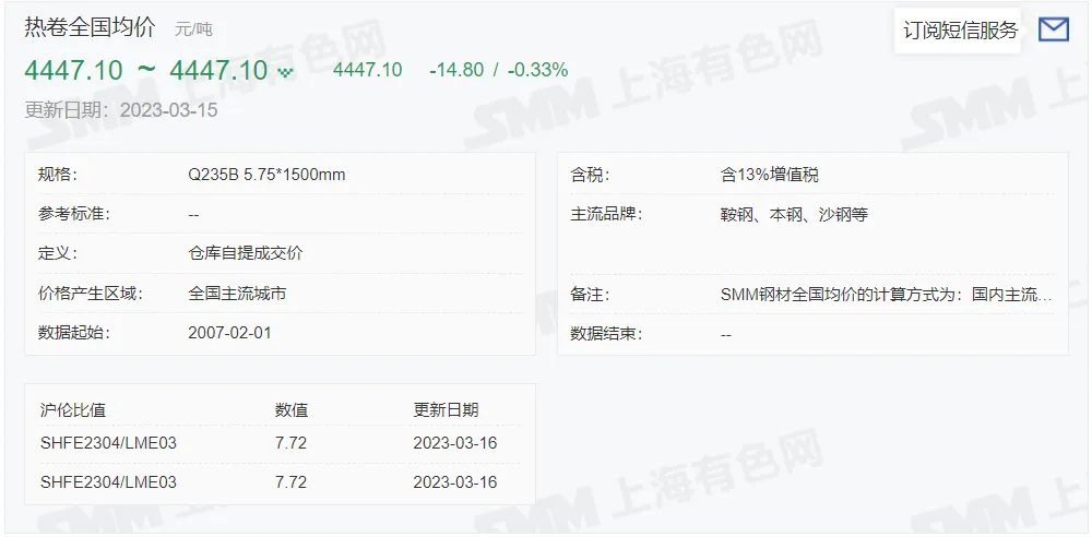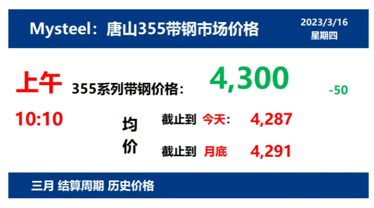 2023年3月16日,上午10:10,唐山355系列带钢市场价格 4300元/吨,较昨降50元/吨;本月结算周期,截止到今天均价:4287元/吨,截止到月底:4291元/吨。