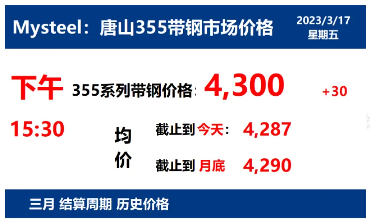 2023年3月17日唐山355带钢市场价格下午15:30,唐山355系列带钢市场价格 4300元/吨,较昨涨30元/吨;本月结算周期,截止到今天均价:4287元/吨,截止到月底:4290元/吨。