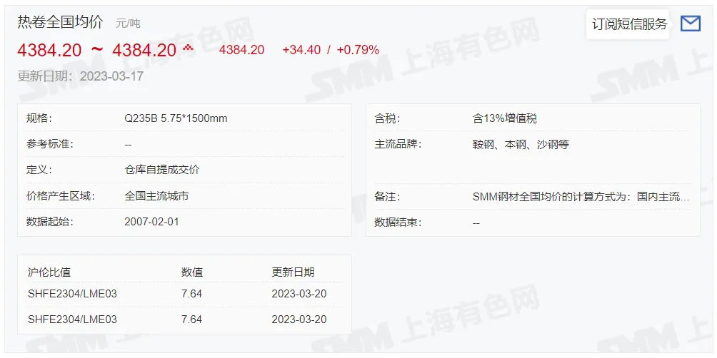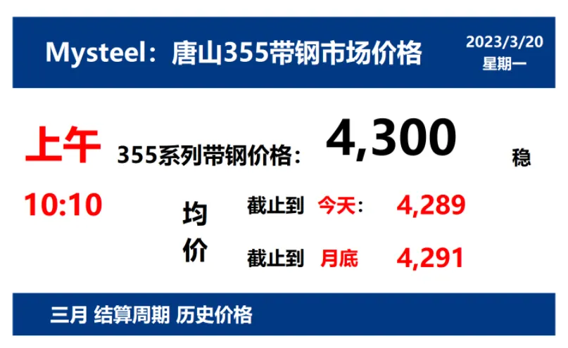 2023年3月20日,上午10:10, 唐山355系列带钢市场价格 4300元/吨,较昨稳;本月结算周期,截止到今天均价:4289元/吨,截止到月底:4291元/吨。