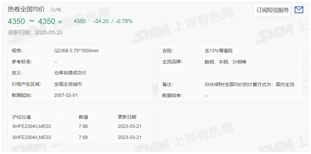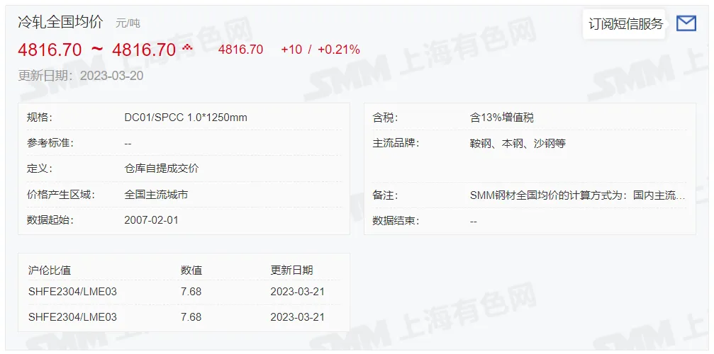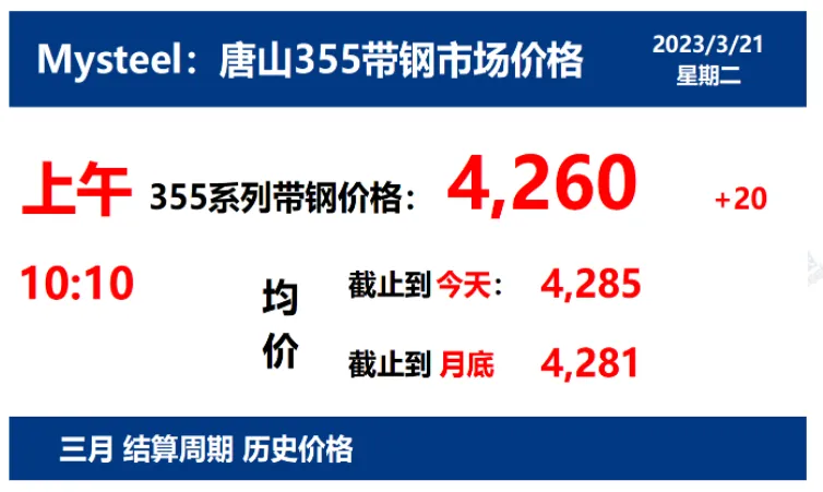 2023年3月21日,上午10:10,唐山355系列带钢市场价格 4260元/吨,较昨涨20元/吨;本月结算周期,截止到今天均价:4285元/吨,截止到月底:4281元/吨。