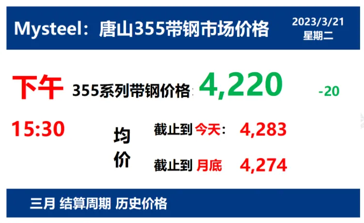 2023年3月21日唐山355带钢市场价格下午15:30,唐山355系列带钢市场价格 4220元/吨,较昨降20元/吨;本月结算周期,截止到今天均价:4283元/吨,截止到月底:4274元/吨。
