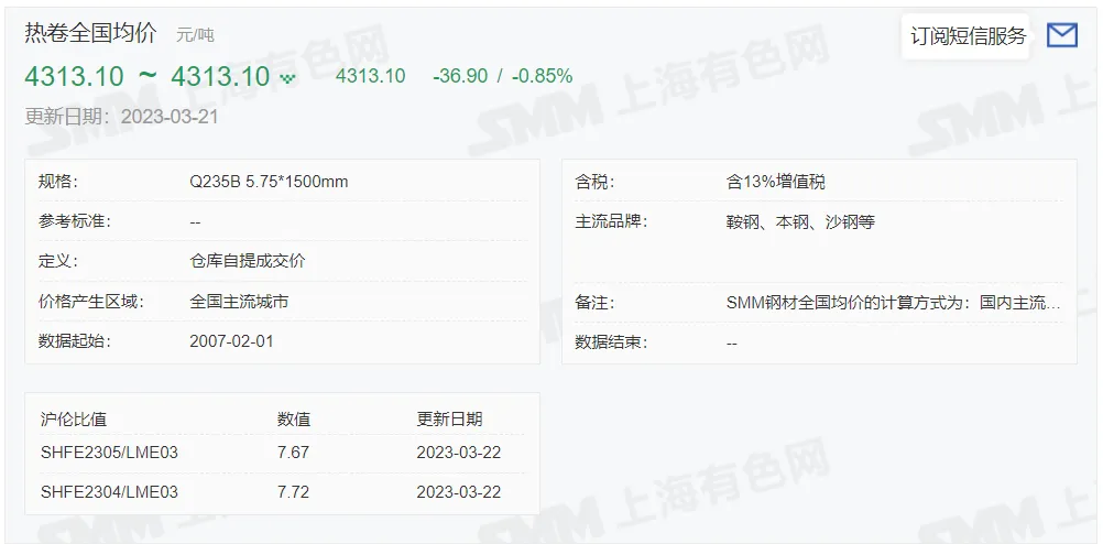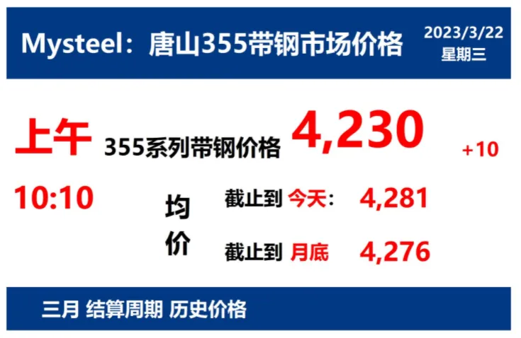 2023年3月22日,上午10:10, 唐山355系列带钢市场价格 4230元/吨,较昨涨10元/吨;本月结算周期,截止到今天均价:4281元/吨,截止到月底:4276元/吨。