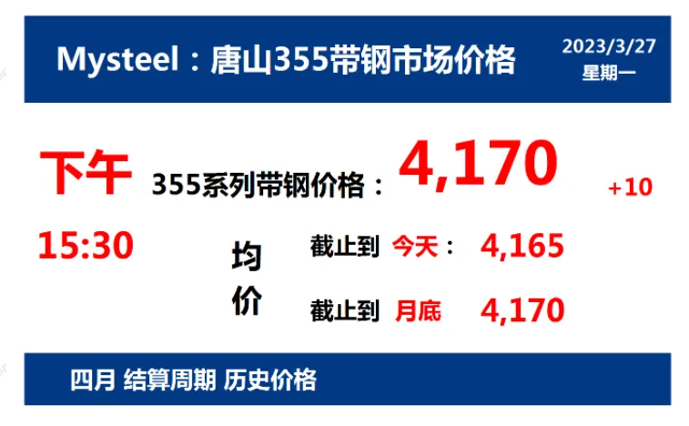 2023年3月27日,下午15:30, 唐山355系列带钢市场价格 4170元/吨,较昨涨10元/吨;本月结算周期,截止到今天均价:4165元/吨,截止到月底:4170元/吨。
