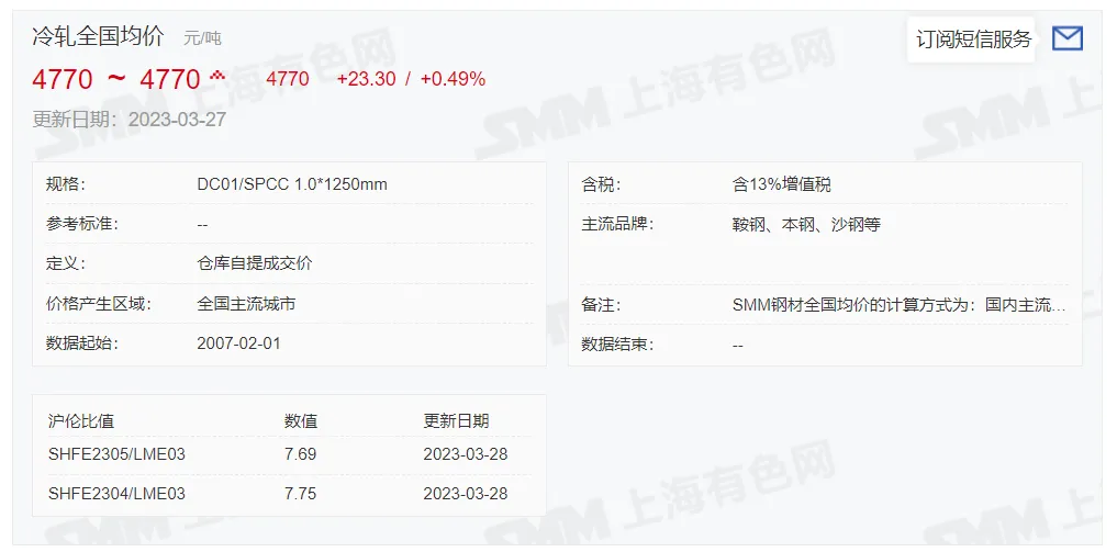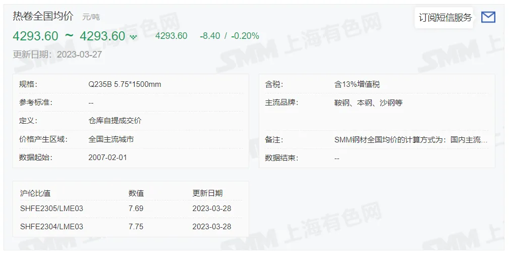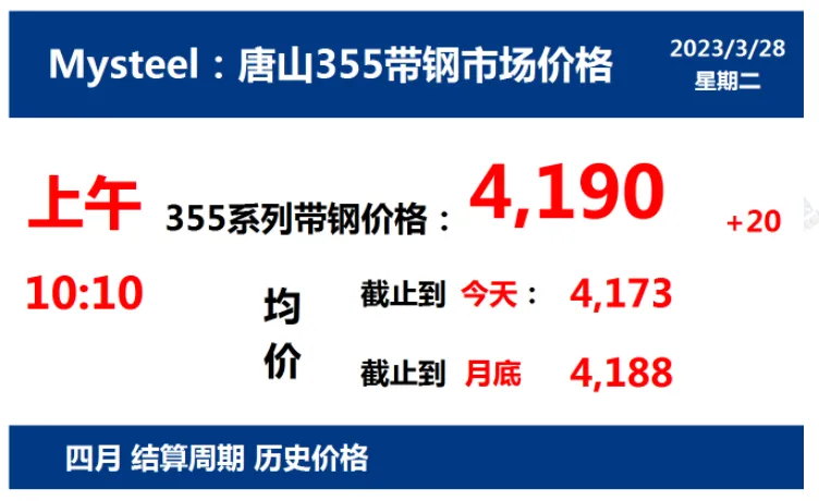 2023年3月28日,上午10:10, 唐山355系列带钢市场价格 4190元/吨,较昨涨20元/吨;本月结算周期,截止到今天均价:4173元/吨,截止到月底:4188元/吨。