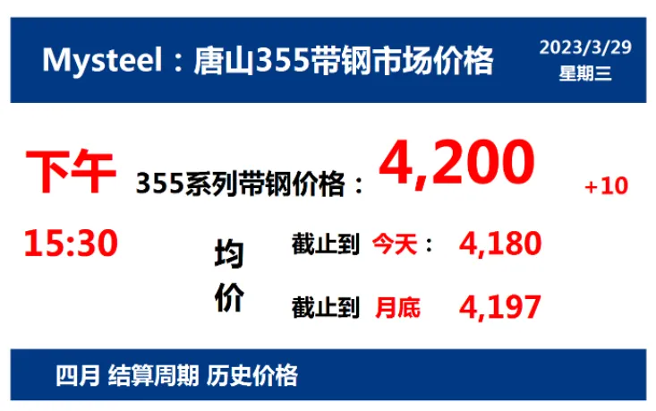 2023年3月29日,下午15:30, 唐山355系列带钢市场价格 4200元/吨,较昨涨10元/吨;本月结算周期,截止到今天均价:4180元/吨,截止到月底:4197元/吨。