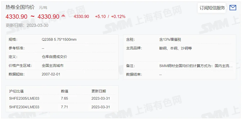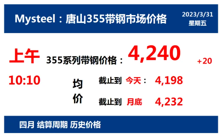 2023年3月31日,上午10:10, 唐山355系列带钢市场价格 4240元/吨,较昨涨20元/吨;本月结算周期,截止到今天均价:4198元/吨,截止到月底:4232元/吨。