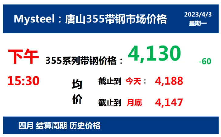 2023年4月3日,下午15:30, 唐山355系列带钢市场价格 4130元/吨,较昨降60元/吨;本月结算周期,截止到今天均价:4188元/吨,截止到月底:4147元/吨。