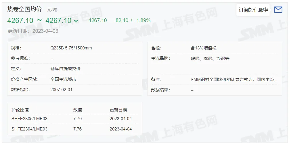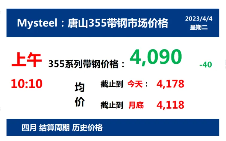 2023年4月4日,上午10:10, 唐山355系列带钢市场价格 4090元/吨,较昨降40元/吨;本月结算周期,截止到今天均价:4178元/吨,截止到月底:4118元/吨。