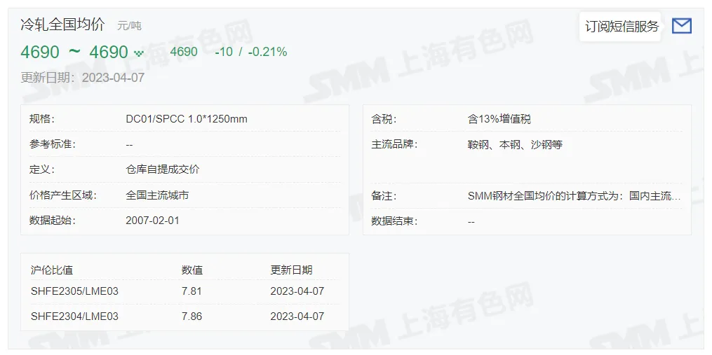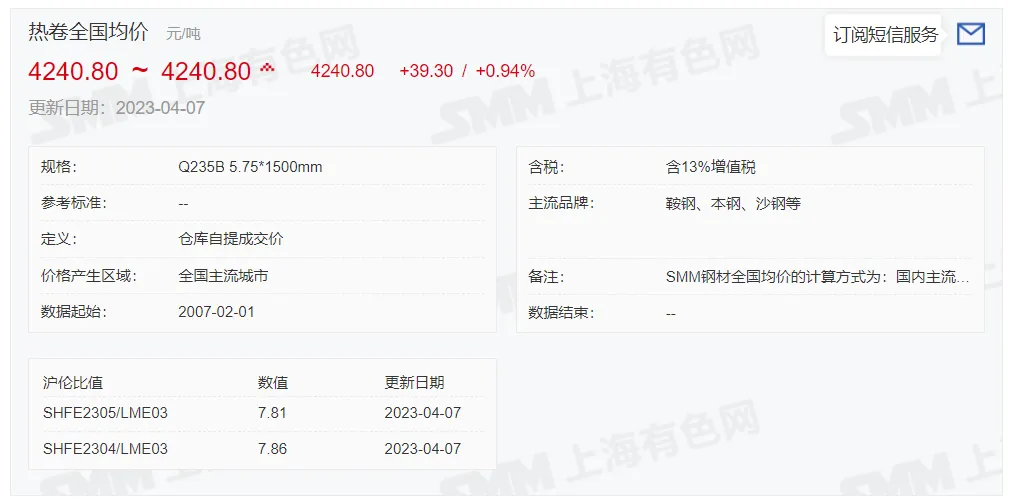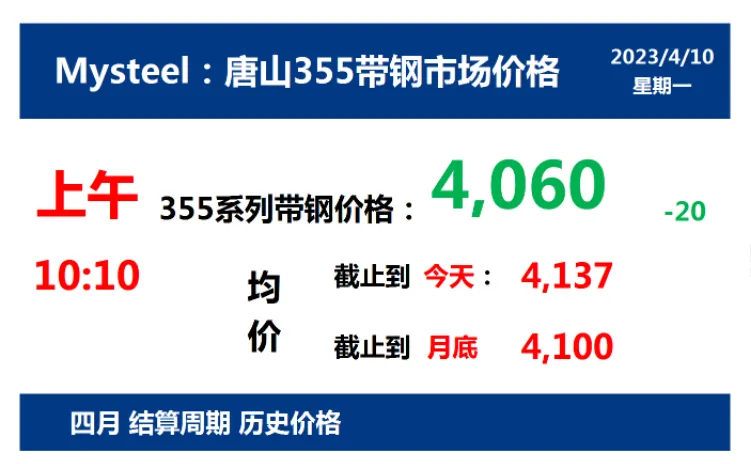 2023年4月10日,上午10:10, 唐山355系列带钢市场价格 4060元/吨,较昨降20元/吨;本月结算周期,截止到今天均价:4137元/吨,截止到月底:4100元/吨。