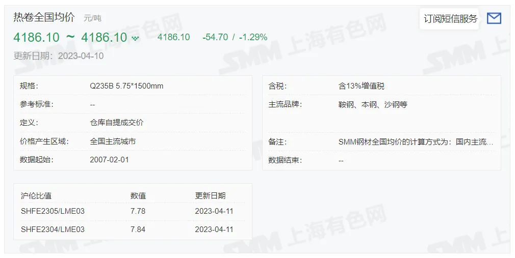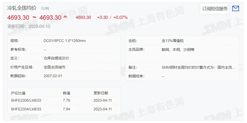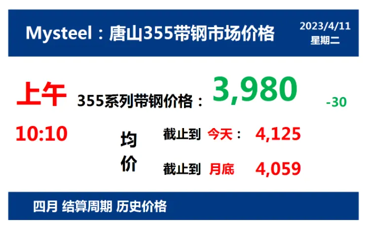 2023年4月11日,上午10:10, 唐山355系列带钢市场价格 3980元/吨,较昨降30元/吨;本月结算周期,截止到今天均价:4125元/吨,截止到月底:4059元/吨。