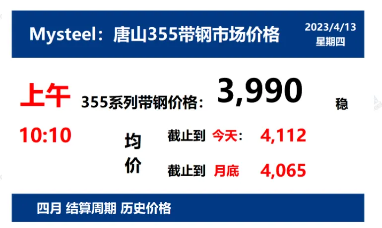 2023年4月13日,上午10:10, 唐山355系列带钢市场价格 3990元/吨,较昨稳;本月结算周期,截止到今天均价:4112元/吨,截止到月底:4065元/吨。