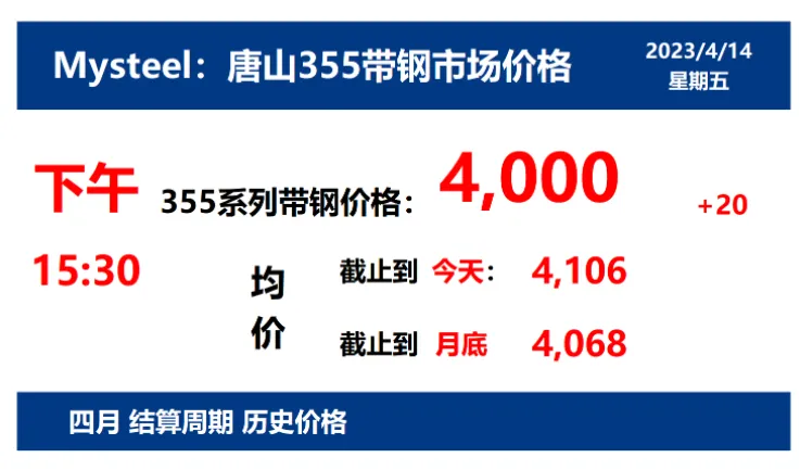 2023年4月14日唐山355带钢市场价格下午15:30,唐山355系列带钢市场价格 4000元/吨,较昨涨20元/吨;本月结算周期,截止到今天均价:4106元/吨,截止到月底:4068元/吨。