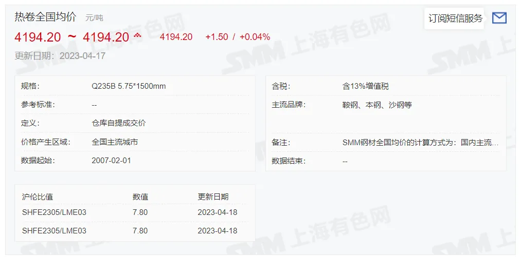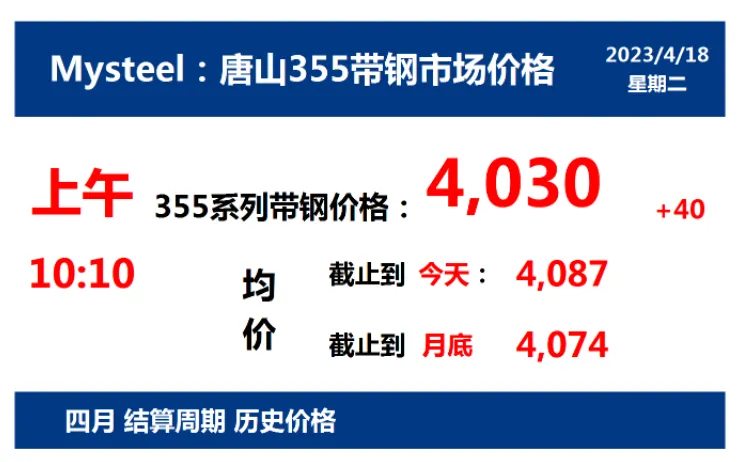 2023年4月18日,上午10:10, 唐山355系列带钢市场价格 4030元/吨,较昨涨40元/吨;本月结算周期,截止到今天均价:4087元/吨,截止到月底:4074元/吨。