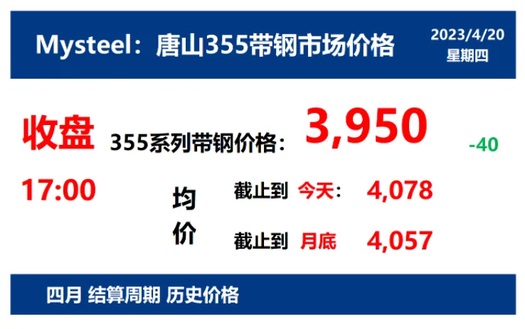 2023年4月20日,下午15:30, 唐山355系列带钢市场价格 3950元/吨,较昨降40元/吨;本月结算周期,截止到今天均价:4078元/吨,截止到月底:4057元/吨。