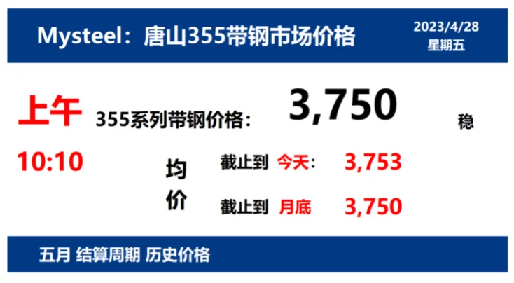 2023年4月28日,上午10:10,唐山355系列带钢市场价格 3750元/吨,较昨稳;本月结算周期,截止到今天均价:3753元/吨,截止到月底:3750元/吨。