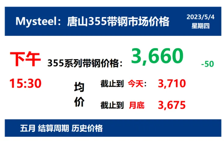 2023年5月4日,下午15:30, 唐山355系列带钢市场价格 3660元/吨,较昨降50元/吨;本月结算周期,截止到今天均价:3710元/吨,截止到月底:3675元/吨。