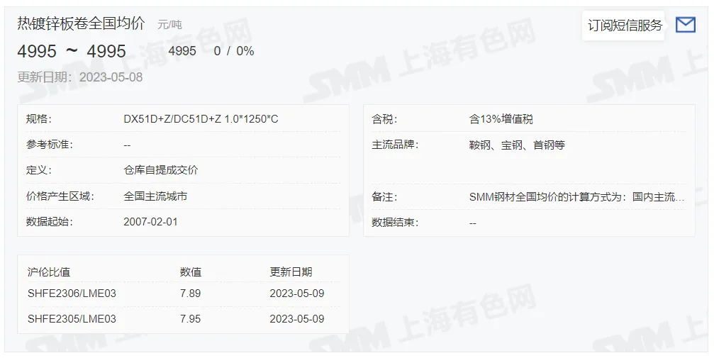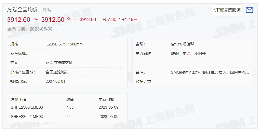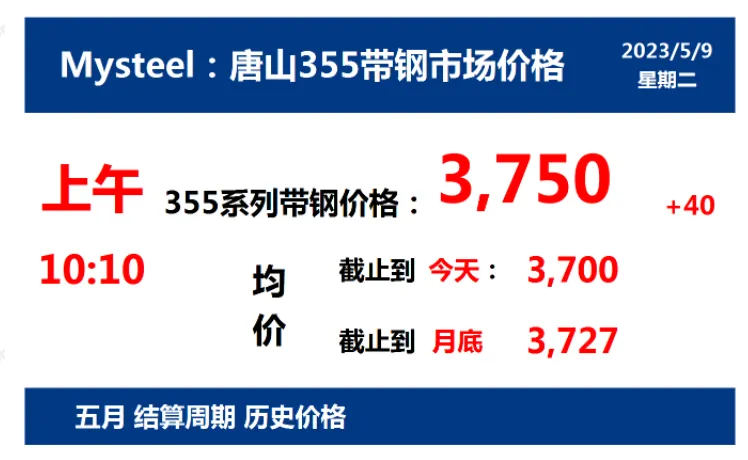 2023年5月9日,上午10:10, 唐山355系列带钢市场价格 3750元/吨,较昨涨40元/吨;本月结算周期,截止到今天均价:3700元/吨,截止到月底:3727元/吨。