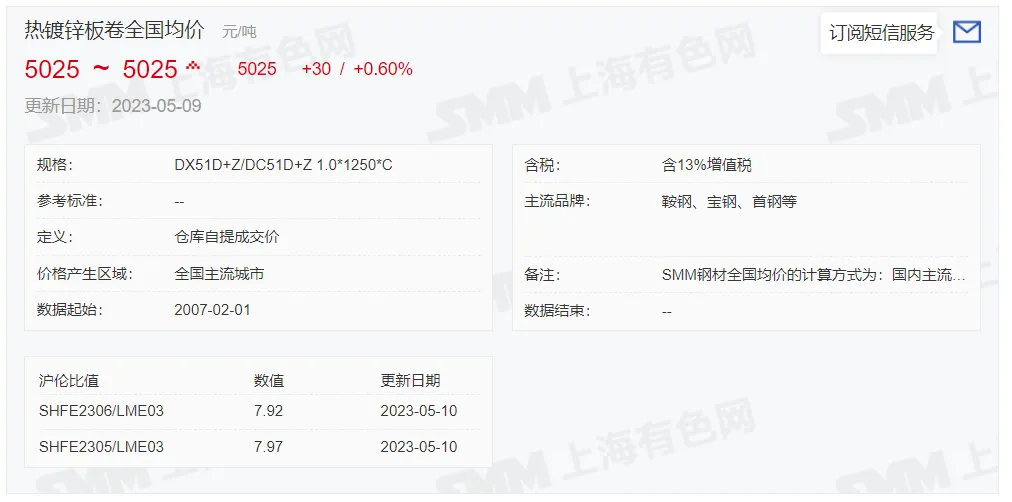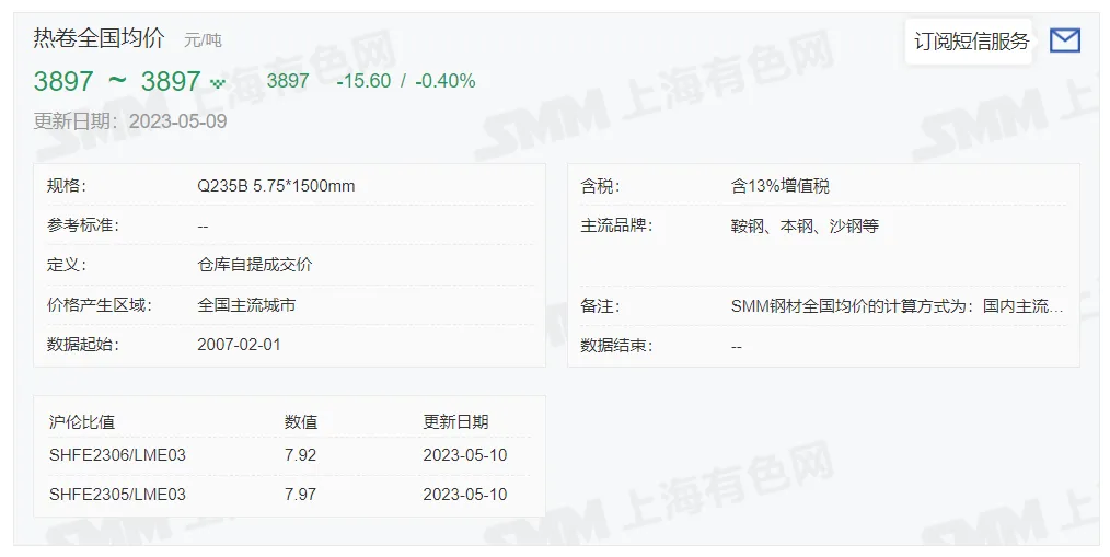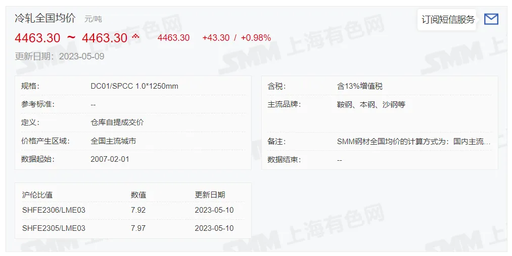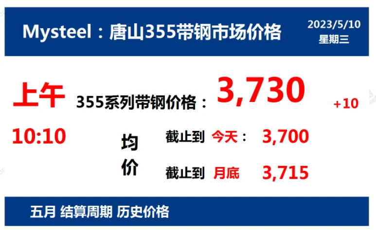 2023年5月10日,上午10:10, 唐山355系列带钢市场价格 3730元/吨,较昨涨10元/吨;本月结算周期,截止到今天均价:3700元/吨,截止到月底:3715元/吨。