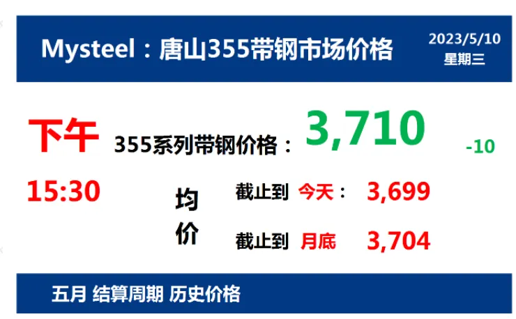 2023年5月10日,下午15:30, 唐山355系列带钢市场价格 3710元/吨,较昨降10元/吨;本月结算周期,截止到今天均价:3699元/吨,截止到月底:3704元/吨。