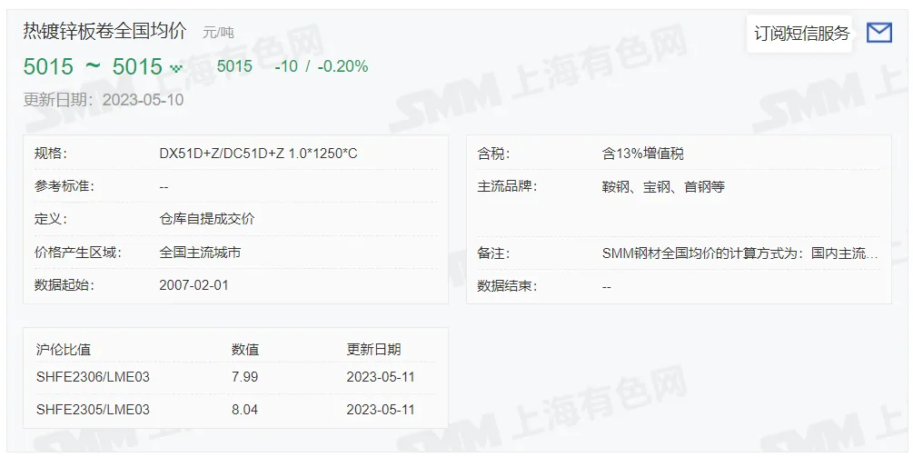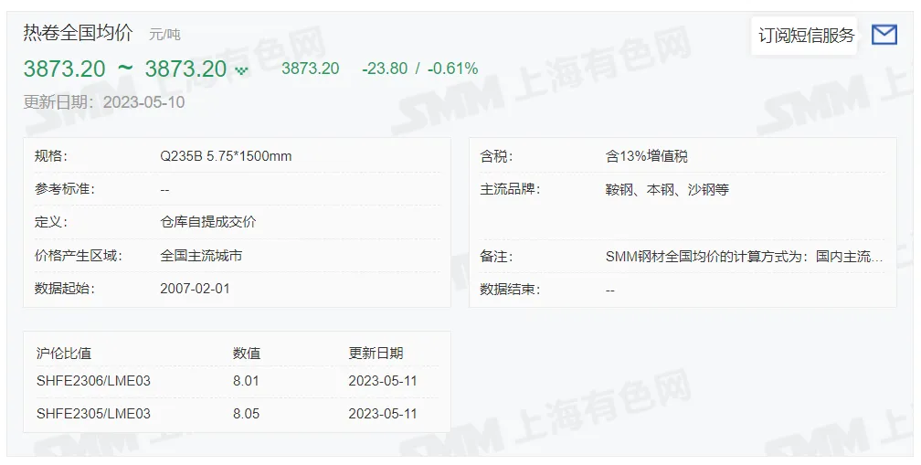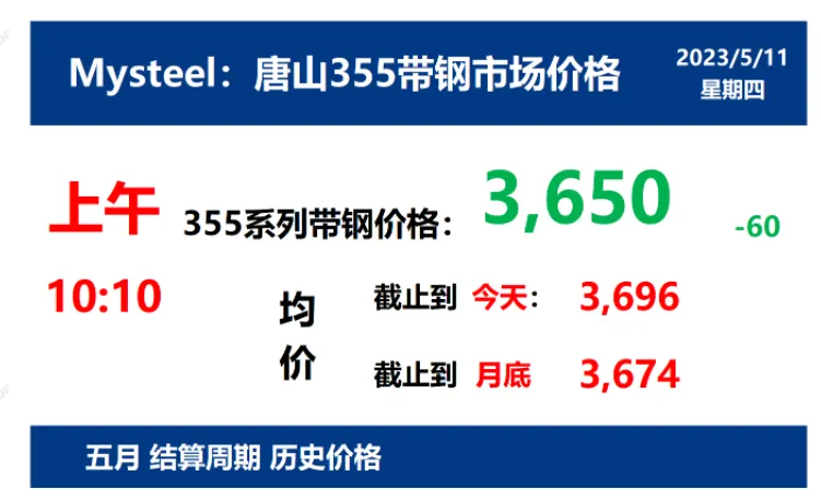 2023年5月11日,上午10:10, 唐山355系列带钢市场价格 3650元/吨,较昨降60元/吨;本月结算周期,截止到今天均价:3696元/吨,截止到月底:3674元/吨。