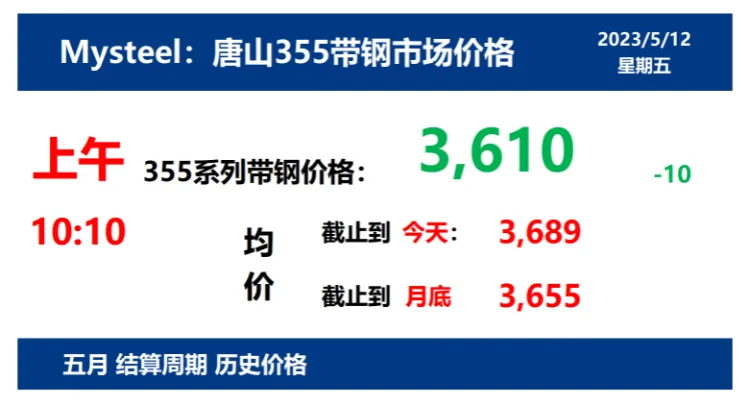 2023年5月12日,上午10:10,唐山355系列带钢市场价格 3610元/吨,较昨降10元/吨;本月结算周期,截止到今天均价:3689元/吨,截止到月底:3655元/吨。