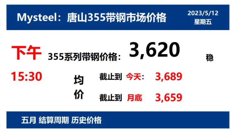2023年5月12日唐山355带钢市场价格下午15:30,唐山355系列带钢市场价格 3620元/吨,较昨稳;本月结算周期,截止到今天均价:3689元/吨,截止到月底:3659元/吨。