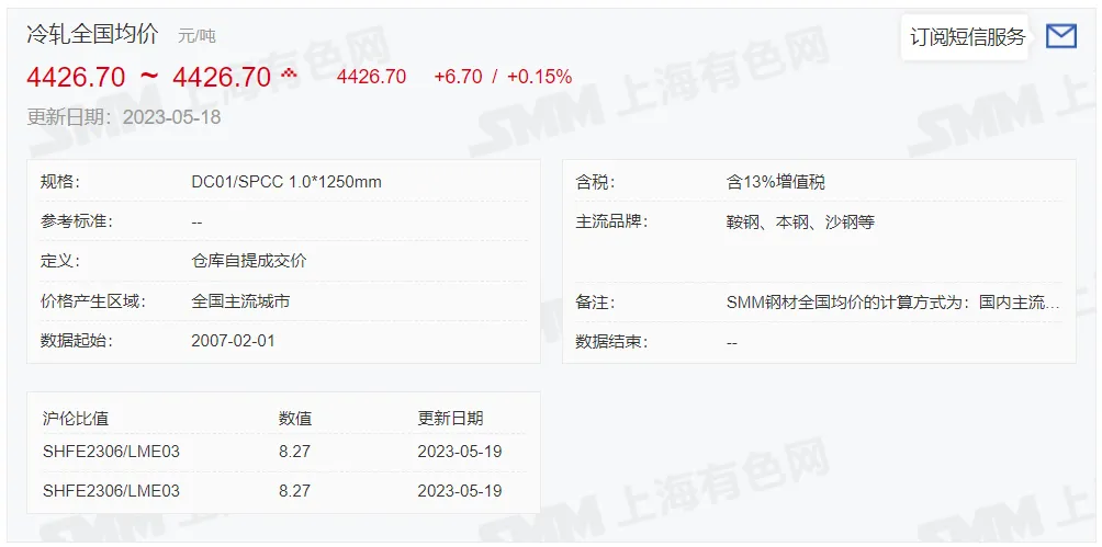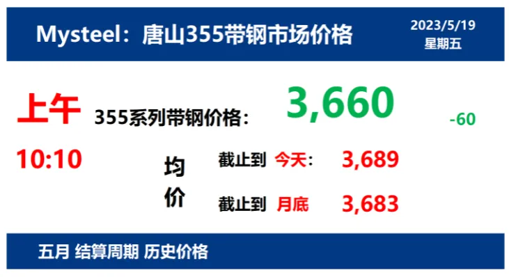 2023年5月19日,上午10:10,唐山355系列带钢市场价格 3660元/吨,较昨降60元/吨;本月结算周期,截止到今天均价:3689元/吨,截止到月底:3683元/吨。