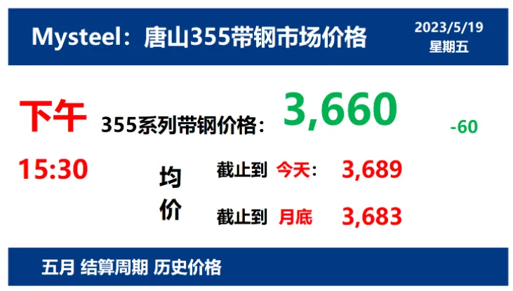 2023年5月19日唐山355带钢市场价格下午15:30,唐山355系列带钢市场价格 3660元/吨,较昨降60元/吨;本月结算周期,截止到今天均价:3689元/吨,截止到月底:3683元/吨。