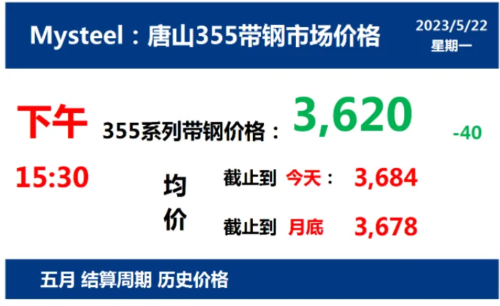 2023年5月22日,下午15:30, 唐山355系列带钢市场价格 3620元/吨,较昨降40元/吨;本月结算周期,截止到今天均价:3684元/吨,截止到月底:3678元/吨。