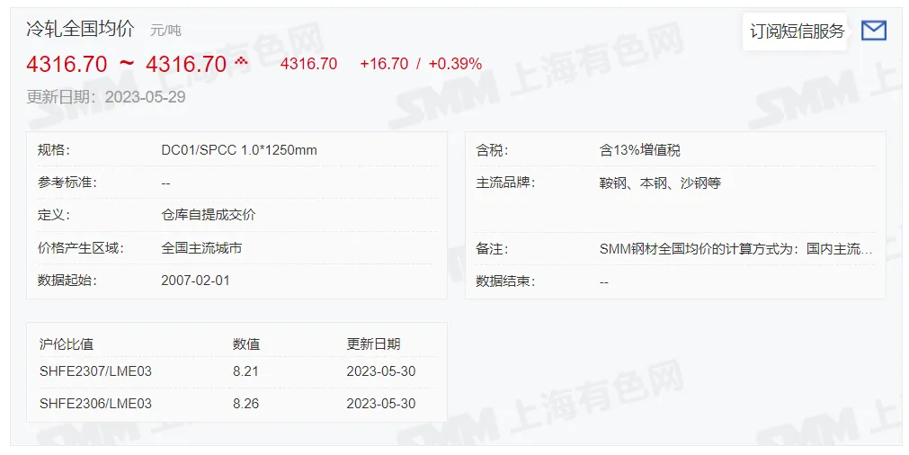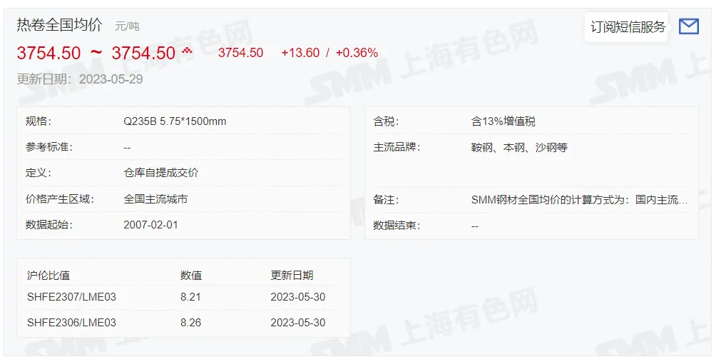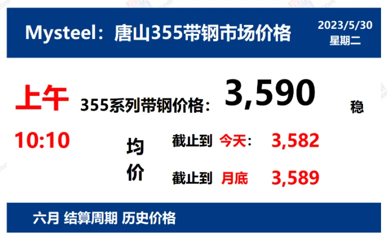 2023年5月30日,上午10:10, 唐山355系列带钢市场价格 3590元/吨,较昨持稳;本月结算周期,截止到今天均价:3582元/吨,截止到月底:3589元/吨。