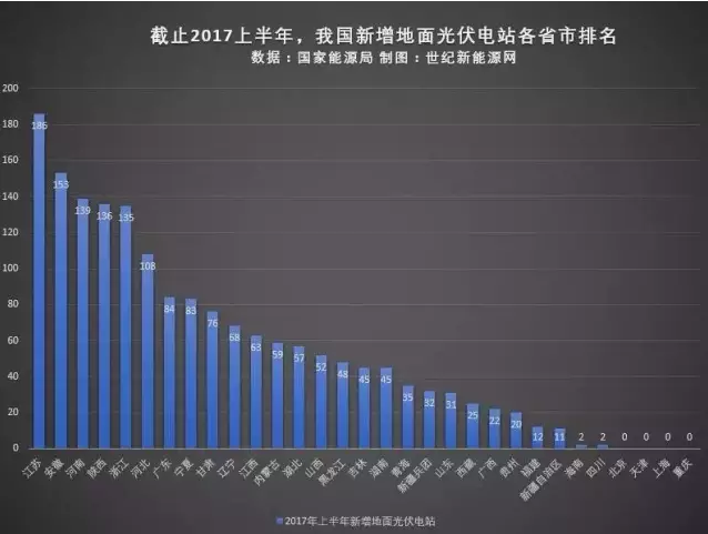 根据国家能源局最新发布的“2017年上半年光伏发电建设运行信息简况”显示,全国新增装机分布由西北地区向中东部地区转移的趋势更加明显,华东地区新增装机为8.25GW,同比增加1.5倍,占全国的34%,其中浙江,江苏和安徽三省新增装机均超过2GW,华中地区新增装机4.23GW,同比增加37%,占全国的17.3%。