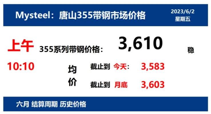 2023年6月2日,上午10:10,唐山355系列带钢市场价格 3610元/吨,较昨稳;本月结算周期,截止到今天均价:3583元/吨,截止到月底:3603元/吨。