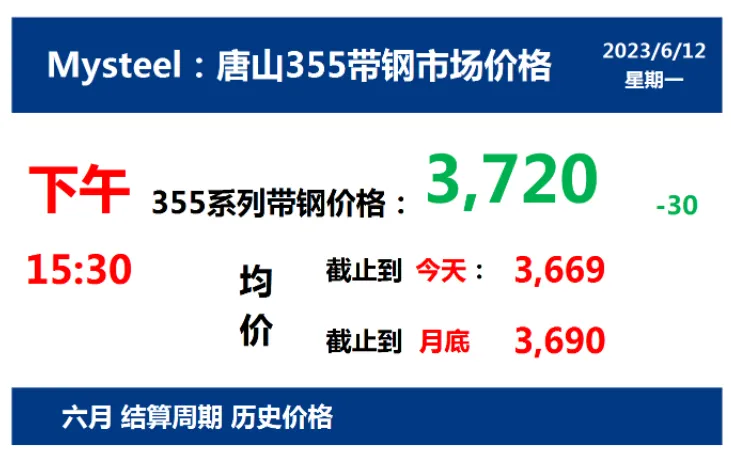 2023年6月12日,下午15:30, 唐山355系列带钢市场价格 3720元/吨,较昨降30元/吨;本月结算周期,截止到今天均价:3669元/吨,截止到月底:3690元/吨。