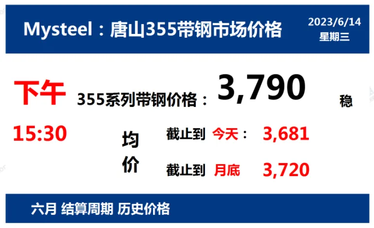 2023年6月14日,下午15:30, 唐山355系列带钢市场价格 3790元/吨,较昨稳;本月结算周期,截止到今天均价:3681元/吨,截止到月底:3720元/吨。