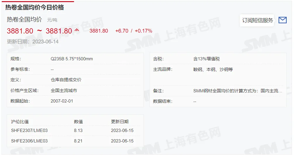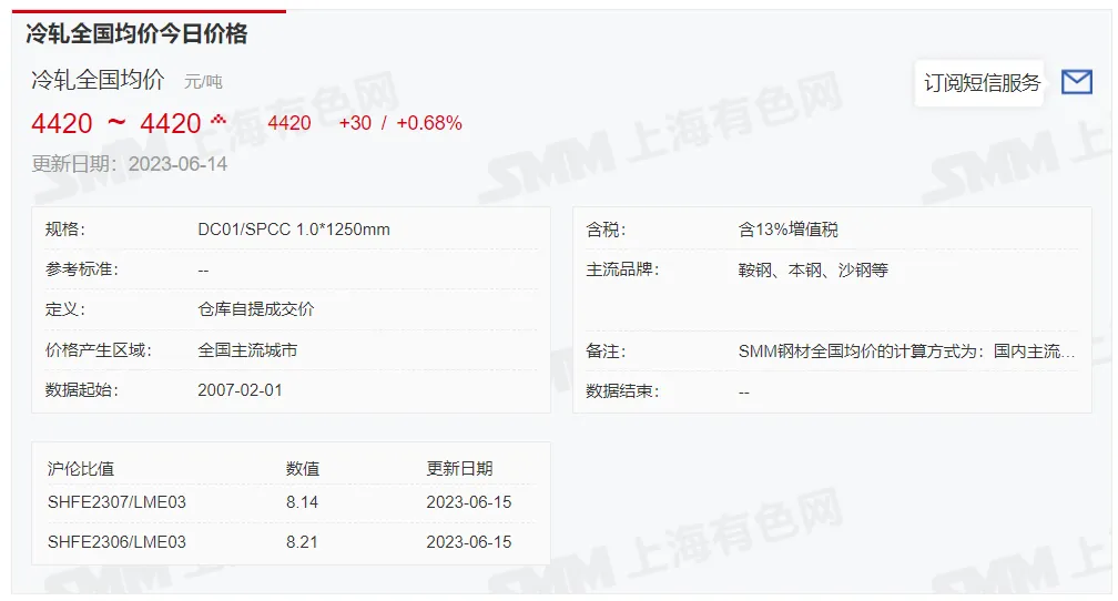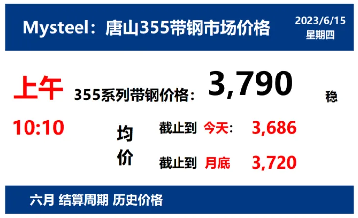 2023年6月15日,上午10:10, 唐山355系列带钢市场价格 3790元/吨,较昨稳;本月结算周期,截止到今天均价:3686元/吨,截止到月底:3720元/吨。