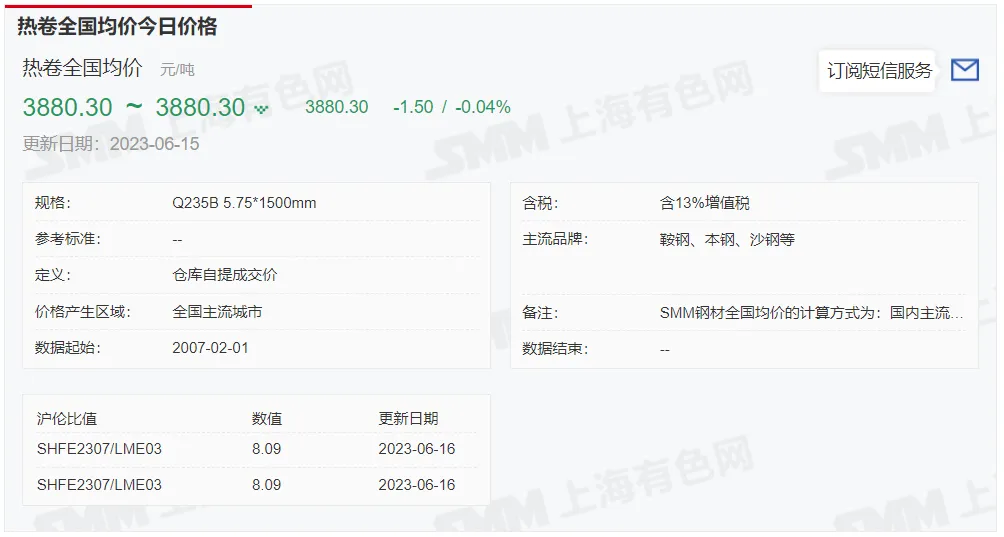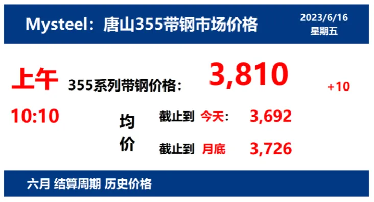 2023年6月16日,上午10:10,唐山355系列带钢市场价格 3810元/吨,较昨涨10元/吨;本月结算周期,截止到今天均价:3692元/吨,截止到月底:3726元/吨。