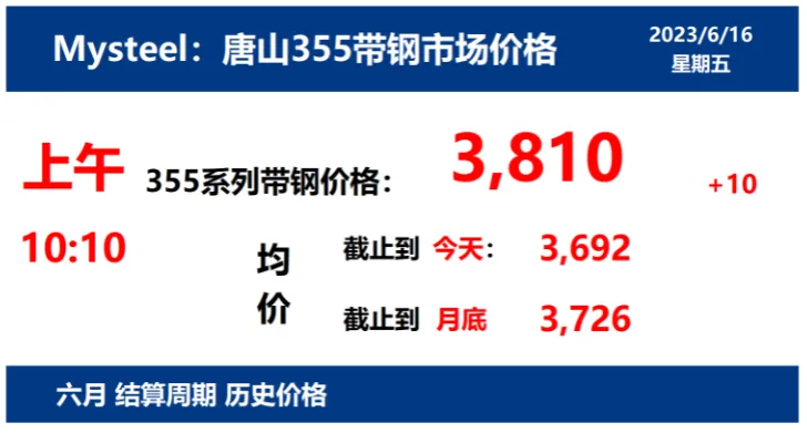 2023年6月16日唐山355带钢市场价格下午15:30,唐山355系列带钢市场价格 3830元/吨,较昨涨30元/吨;本月结算周期,截止到今天均价:3693元/吨,截止到月底:3733元/吨。