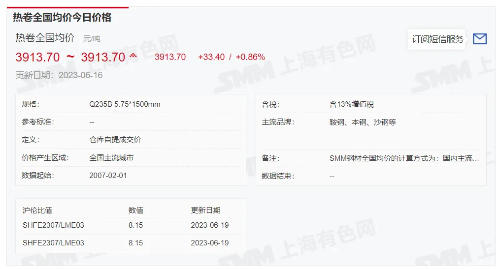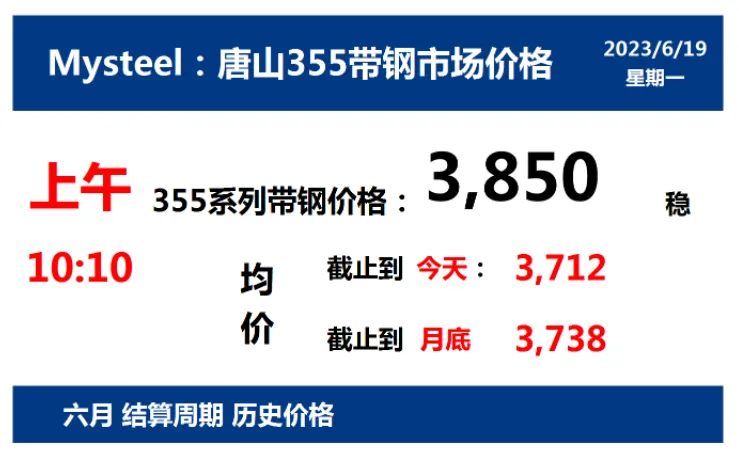 2023年6月19日,上午10:10, 唐山355系列带钢市场价格 3850元/吨,较昨稳;本月结算周期,截止到今天均价:3712元/吨,截止到月底:3738元/吨。