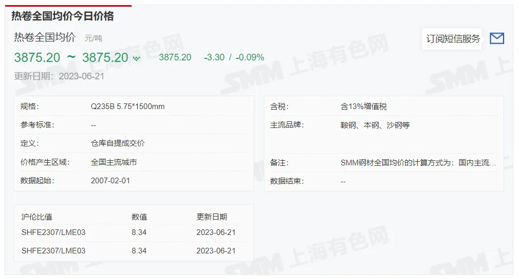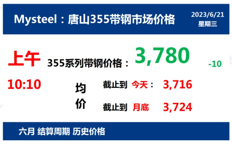 2023年6月21日,上午10:10, 唐山355系列带钢市场价格 3780元/吨,较昨降10元/吨;本月结算周期,截止到今天均价:3716元/吨,截止到月底:3724元/吨。