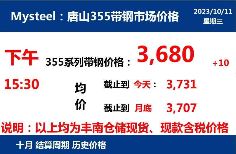 2023年10月11日,下午15:30, 唐山355系列带钢市场价格 3680元/吨,较昨涨10元/吨;本月结算周期,截止到今天均价:3731元/吨,截止到月底:3707元/吨。