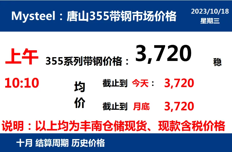 2023年10月18日,上午10:10, 唐山355系列带钢市场价格 3720元/吨,较昨稳;本月结算周期,截止到今天均价:3720元/吨,截止到月底:3720元/吨。