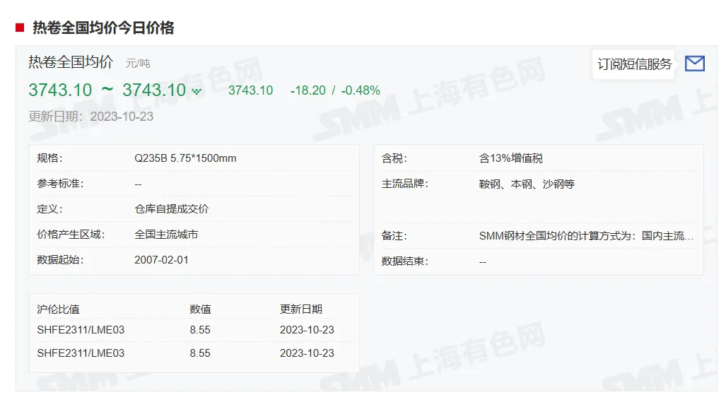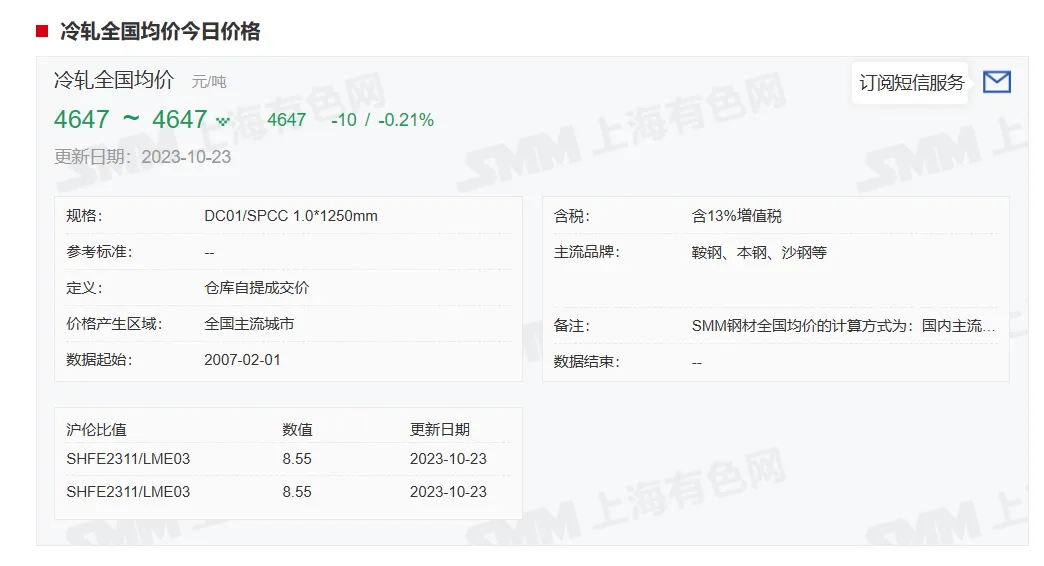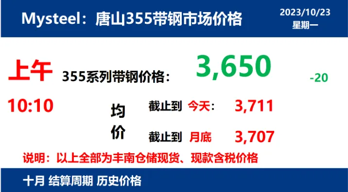 2023年10月23日,上午10:10, 唐山355系列带钢市场价格 3650元/吨,较昨降20元/吨;本月结算周期,截止到今天均价:3711元/吨,截止到月底:3707元/吨。