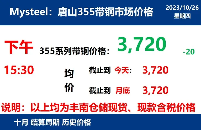 2023年10月26日,下午15:30, 唐山355系列带钢市场价格 3720元/吨,较昨降20元/吨;本月结算周期,截止到今天均价:3720元/吨,截止到月底:3720元/吨。